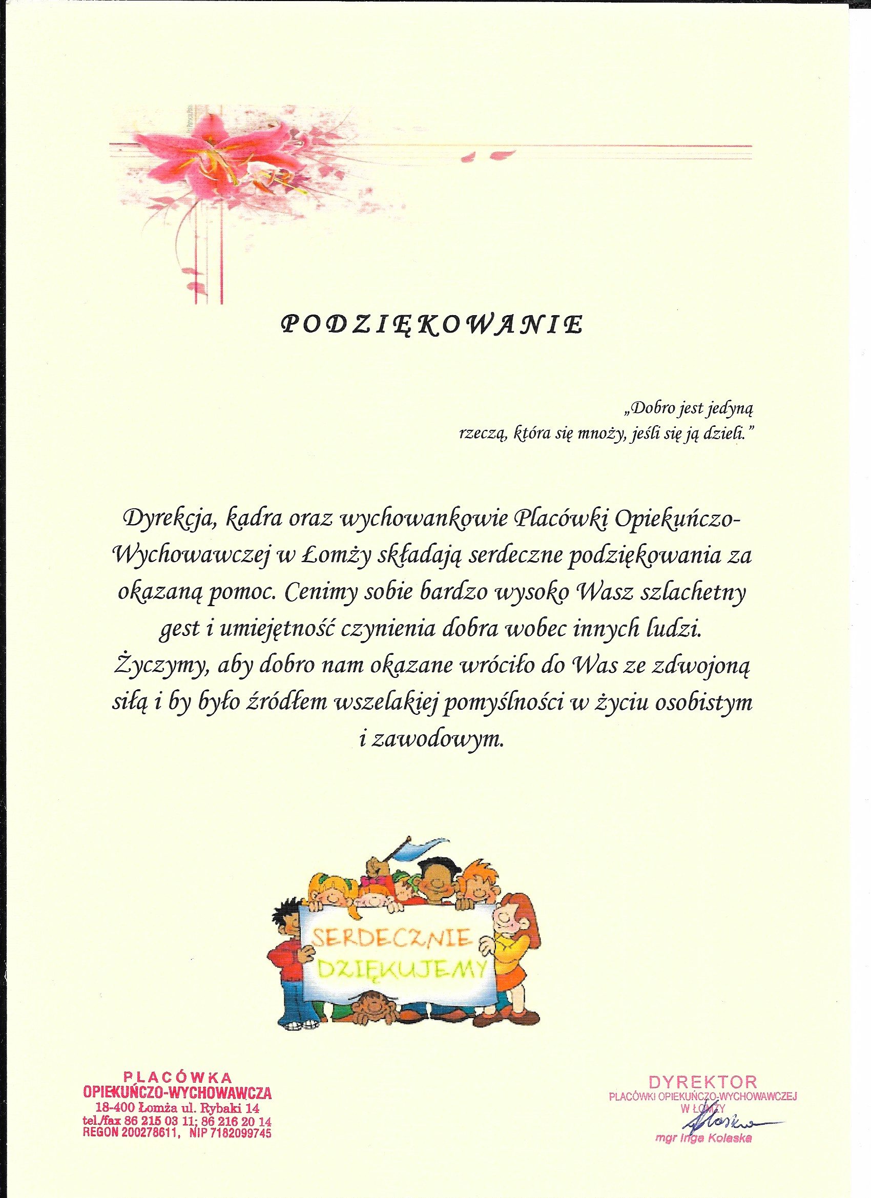 W marcu w naszej szkole została zorganizowana zbiórka słodyczy dla podopiecznych Placówki Opiekuńczo-Wychowawczej w Łomży. Słodycze zostały dostarczone przed świętami Wielkanocnymi, a nasza szkoła otrzymała następujące podziękowanie: